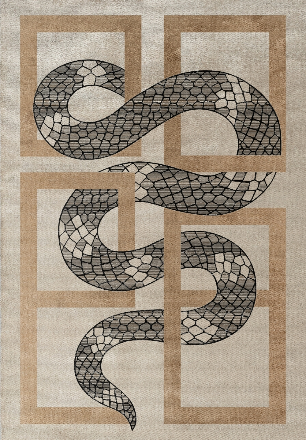Its very presence is designed to challenge and captivate, crafted for those who live unafraid in tension—those who understand that to walk in truth is to wrestle with shadow. In its most sacred reading, this rug echoes Genesis 3:15—the ancient prophecy of the heel that will crush the serpent’s head. To place NYOKA beneath your feet is to enact that promise: to step into your power, into your transformation, to rise from the ruin.